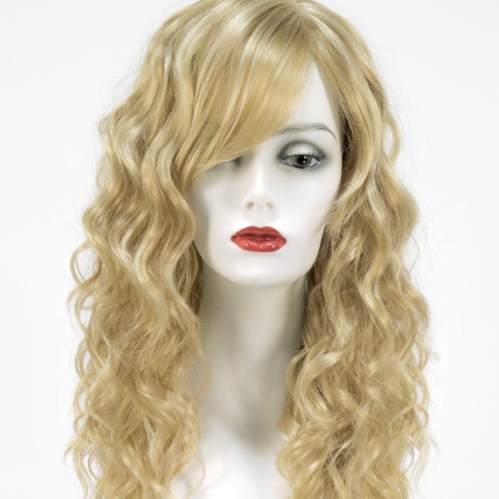 The color is shown in the video and in the last pictures, it is a one with highlights. Features long, romantic curls with straight bangs that give this curly look a modern twist. The length is versatile and can be worn in a loose, low updo, or you can wear it half-up, half-down for a completely different look. The skin top is perfectly placed to give the look of a natural part line at the crown. See listings for new wig colors and styles arriving daily. All wigs are synthetic unless otherwise noted, all wigs are one size with adjustable tabs unless otherwise noted, and all wigs,