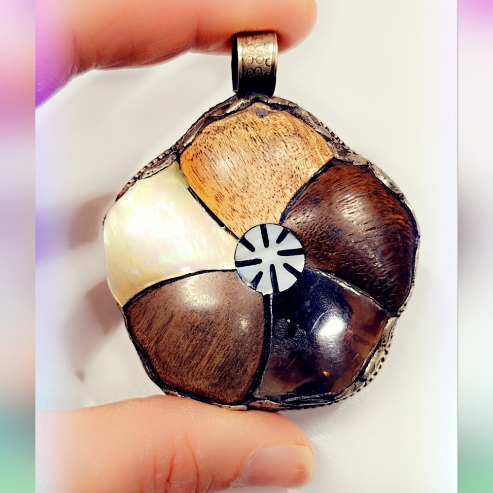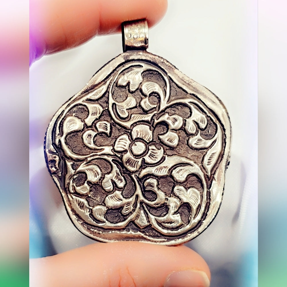 Handmade, in Tibet, these pendants are absolutely exquisite. They're carved on the back with a beautiful design. Looks amazing with a beaded chain