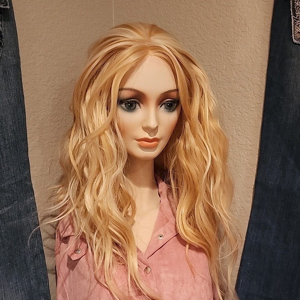 27/613, Strawberry & Blonde. Streaky strawberry with baby blonde. This style also features a lace front for the most realistic hairline. The fiber is heat friendly so you can straighten or curl as you please! Beachy waves and layers....timeless style!